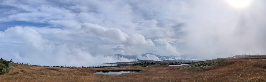 14時、登頂。最後の岩場を越えると「天空の楽園」が広がっている(冒頭の写真)。見渡す限りの湿地が広がり、所々に池塘が見える。木道が整備されていて湿地に人の足が入らないようにされている。尾瀬と似た風景だが、ここには登山しなければ来られない(ということを下山しながら考える)。